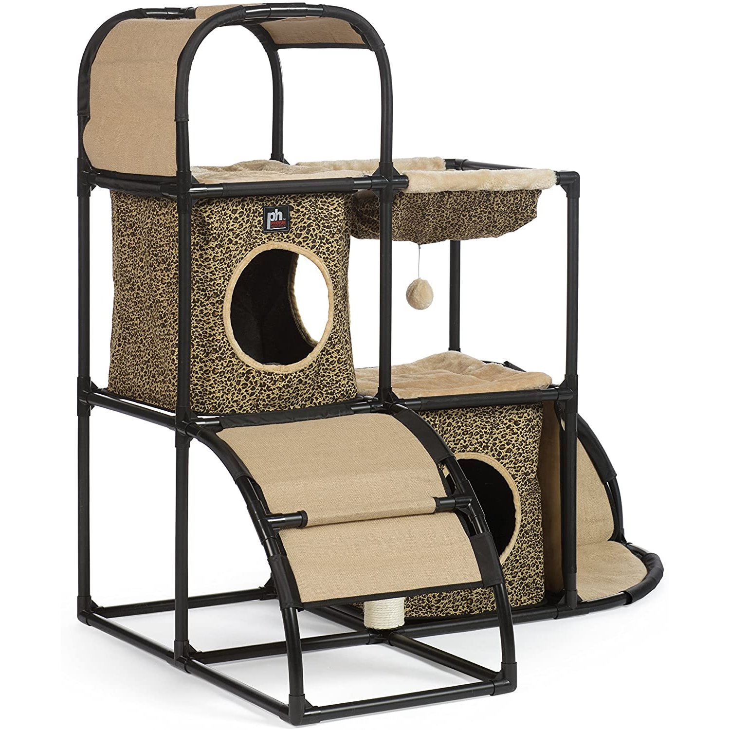 Prevue Pet Products Catville townhome Leopard Print 7235 encourages your cat to be healthy happy and active! watch as kitty engages in energetic activity – playing with the dangling toy, scratching the sisal covered Posts or climbing in, out, over and around the Catville townhome. Cats will happily curl up in either hideaway – one lower-level, one mid-level, each with super soft plush bedding to satisfy all of your cat’s sleeping needs. An additional plush hammock provides the ultimate in lounging pleasure. Two separate scratching Posts encourage exercise as your cat scratches and stretches along the sisal covered Posts, toning muscles while grooming nails and strengthening paws. Durable cloth ramp designed for active jumping, pouncing, climbing and running provides ample opportunity for play. Dens feature more than one doorway making them perfect for games of hide & seek. With areas for playing, napping, lounging, scratching, perching and hiding felines love the full range of amenities created to satisfy behavioral instincts while discouraging destructive behavior and alleviating boredom. Prevue’s Catville townhome Leopard Print and Beige 7235 is a multi-level, multi-purpose, attractive home where multiple cats of any age and activity level will thrive on endless options for sleep or play. Sturdy, yet lightweight, our townhome comes with easy to follow, step-by-step, assembly instructions and measures 45 1/2" long, 31" wide, 42 1/2" high. Fabric components may be hand washed and air dried as needed.