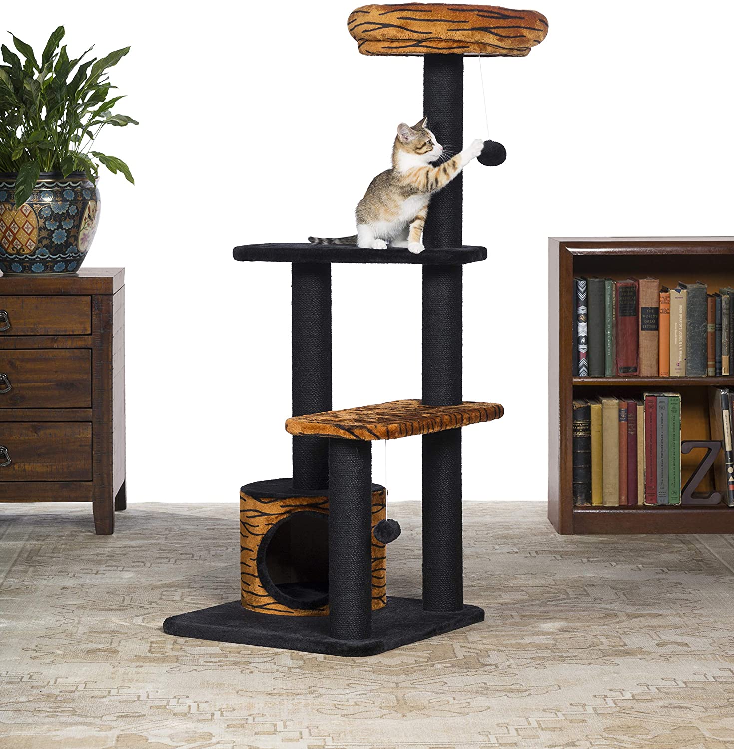 Prevue Pet Products Kitty Power Paws Tiger Tower 7303 combines super soft, plush fabrics with durable jute to provide the perfect place for lounging, sleeping, scratching, hiding and playing. A luxurious tiger print bolstered day bed is a great spot for your kitten or cat to survey its surroundings or take a cat nap. Two plush, dangling, swat toys hang playfully - one from the large cat bed and one from the lower plush platform. Five individual, durable, jute rope scratching posts offer an appealing texture to cats, curbing inappropriate scratching behaviors and saving your sofa. In addition to the cat bed, two rectangular platforms provide opportunities for pouncing and jumping or multiple levels for more than one cat to lounge comfortably. A lower level hideout makes your cat or kitten feel more secure and minimizes social stress. At 4 foot tall, this cat tree utilizes vertical space and a compact footprint to save space in your home while offering your kitty plenty of options to play, sleep and lounge. Expertly designed cat furniture assembles easily and satisfies the needs of cats of all ages, sizes and activity levels. Measures 24" Long, 24" Wide and 48" High.