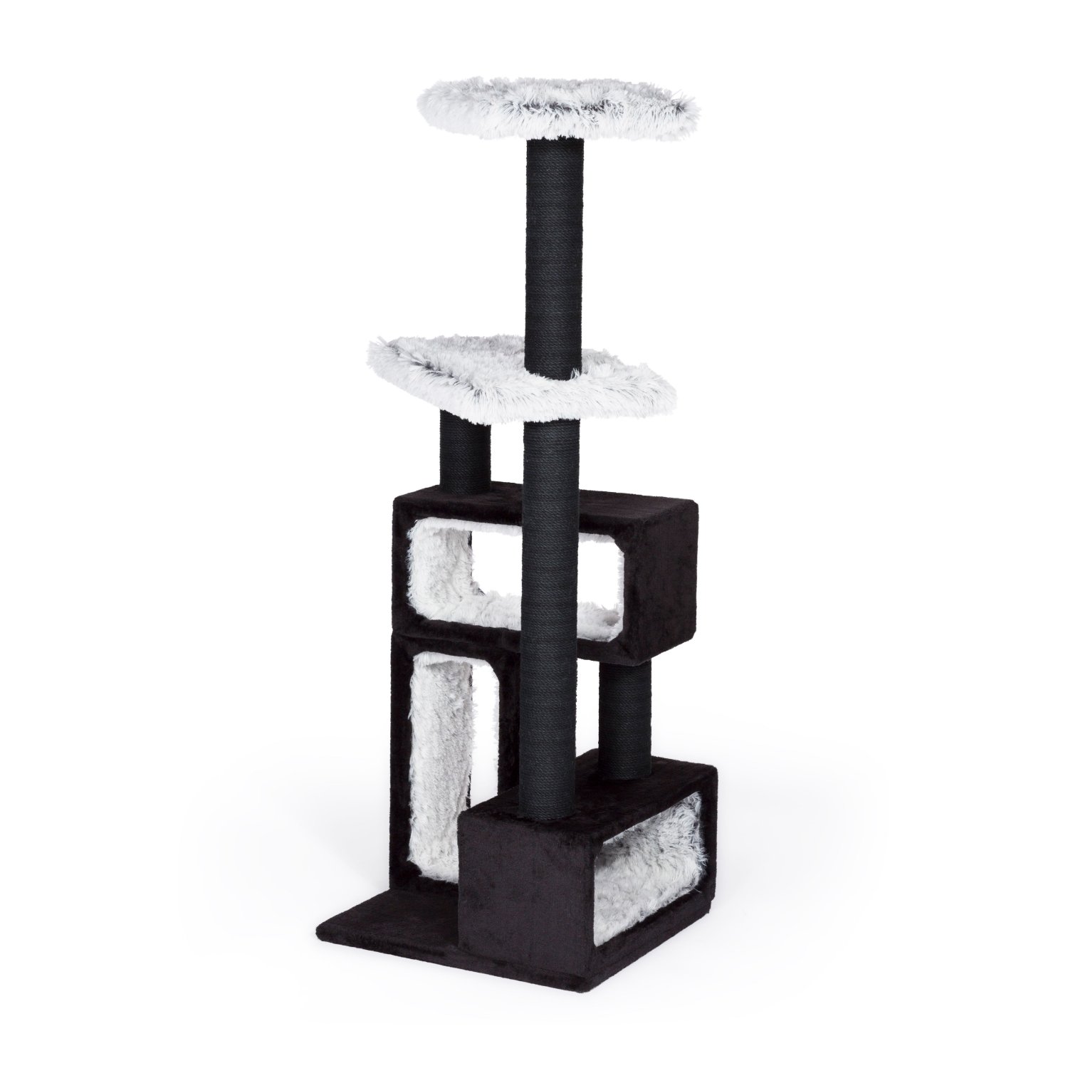 Prevue Pet Products Kitty Power Paws Domino features two platforms covered in soft plush, three hideout spaces, and jute scratching posts. Scratching posts help satisfy natural clawing instincts, helping to keep your furniture safe from destructive restless behaviors. Hideout spots and platforms are coated with soft plush floors and walls, giving your cat or cats comfortable spaces to play, rest, and relax. 24"L x 25"W x 52.5"H. Base is 19.25"L x 17.5"W. Black and Frost White color.