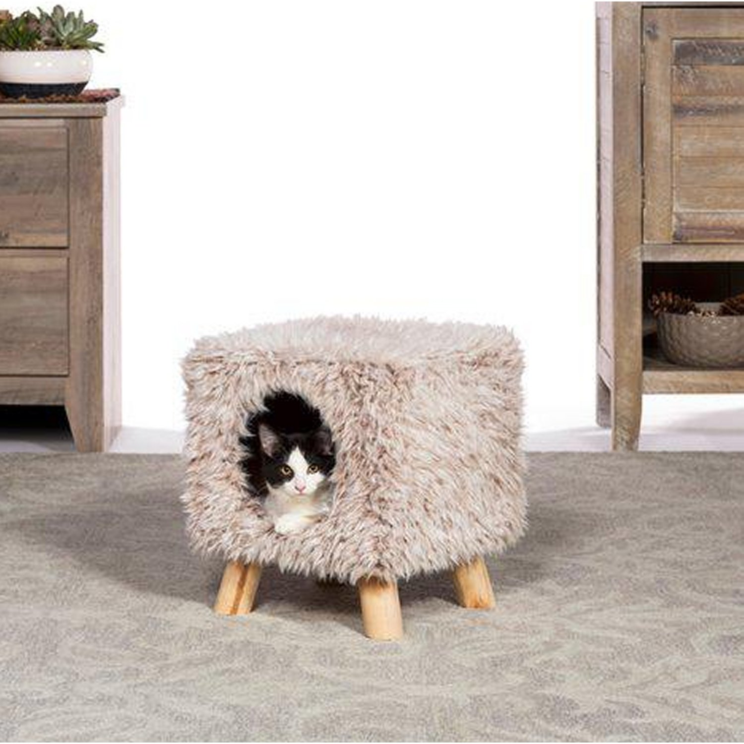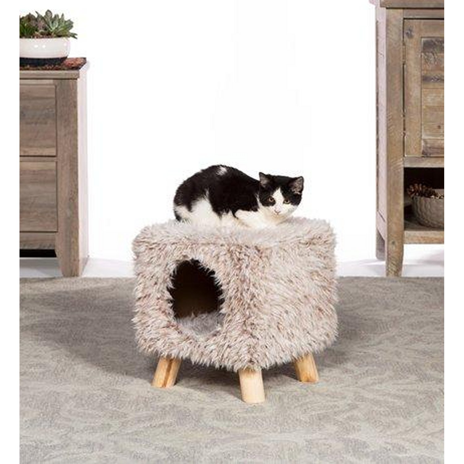Prevue Pet Products Cozy Cube Frost Tan 7380 is a comfy and stylish hideout for your cat or small dog. Ultra-soft, plush, shaggy tan fabric covers the cube and interior floor, providing a covered hideaway where your cat or kitten will feel more secure and avoid social stress. Your pet will love lounging, sleeping or surveying their surroundings from the top of the cube. Frost Tan fabric combined with light colored wooden legs lends a furniture feel, ensuring this cat condo will complement your décor. Our Tan Cozy Cube measures 12’’ long, 12’’ wide and 13 ½’’ high with a 7’’ diameter hideaway opening. Great for pets and kids. Weight limit of 100 lbs.